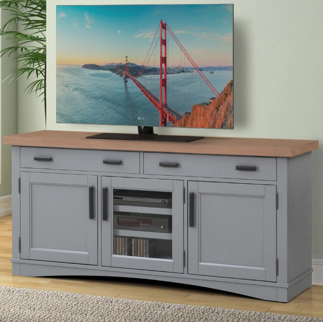 Give your living area an instant refresh with the addition of the Americana Modern 63-inch TV Console with Power Center. A tastefully designed media option, it features closed storage, glass doors for media components, and three finishes to choose from, accented with a contrasting wood-grain top and metal hardware. **Each piece of Parker House furniture is unique and features slightly different colorations. Finish colors vary depending on the screen used for viewing. The best way to ensure your furniture matches your expectations is to see it (or a swatch) in person.